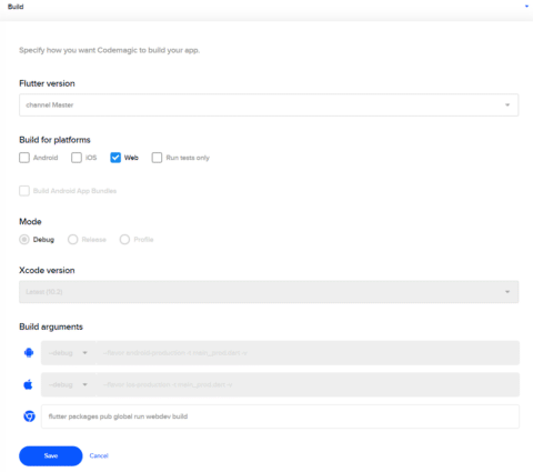 We’ve gone with Flutter’s vision of web as the third platform and integrated support for Flutter web apps as such into our existing CI/CD flow. Web appears as the third platform after Android and iOS under Build for platforms and is automatically selected for web apps. We will definitely keep pace with the Flutter team to be your one and only CI/CD tool dedicated to Flutter apps, on all platforms.