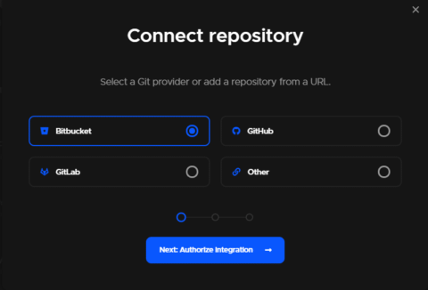 お好みのバージョンコントロールシステムを選択するプロンプトが表示されます。次に、統合を承認する(Next: Authorize integration をクリックして、Codemagic CI/CDに、ご選択されたバージョンコントロールシステムへの承認済みアクセスをご提供ください。