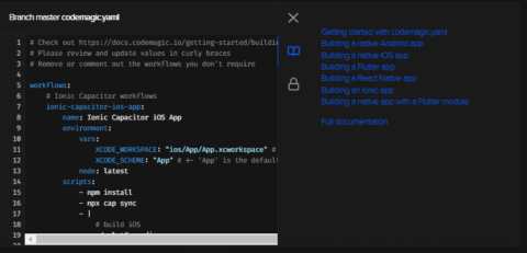 codemagic.yamlファイルのご使用経験がある方は、Ionicプロジェクト用のYAMLテンプレートをこちらから入手できます。